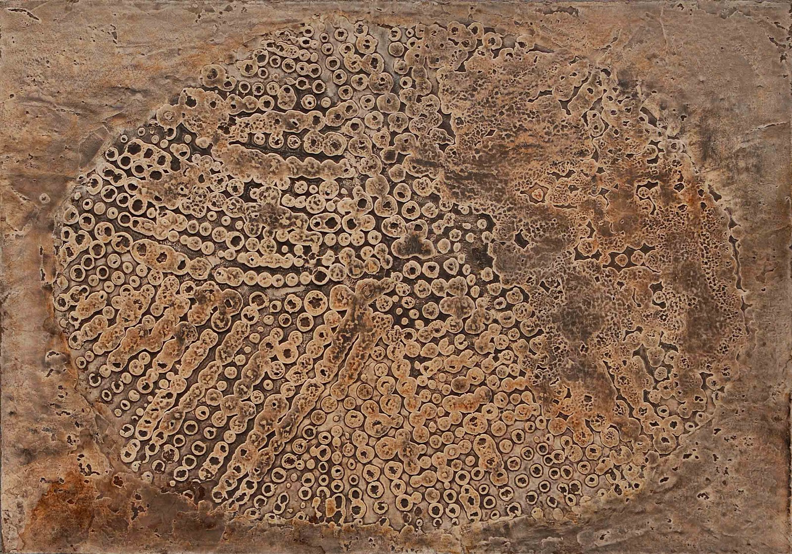 Mi látható a képeken? A Kezdet címűn egy kör alakzat, ami lehet a formálódó földbolygó, de a teljesség szimbóluma, minden élet forrása a nap, vagy a többek között a termékenységet jelképező telihold sziluettje. De lehet kavics, földrög, vagy ab ovo tojás is. Mi volt előbb a tyúk vagy a tojás? Kérdezhetnénk ezen a ponton. Azaz a mű(vész) vagy a művészet? A most látható olajképek egy része fosszília asszociációját kelti, így az előbbi kérdés még élesebben fogalmazható meg: Mi is a művészet? Tekinthetők-e művészeti alkotásoknak azok az esztétikai értékeket is hordozó produktumok, amelyek olyan korban keletkeztek, amely kornak egyáltalán nem volt művészettudata? Bátai Sándor képeinek ősi művészetértelmezéshez való szoros kapcsolatát éppen a földtörténeti folyamatokhoz, a természetben fellelhető, vagy az idő által „megmunkált” felületi hatásokra utaló képi elemek, munkamódszerek erősítik meg. Hiszen az előbb említett, „művészettudattalan” korok „alkotói” számára az elkészített „művek” a varázslás, a rituális mágia eszközei voltak, és éppen olyan valóságosnak érezték őket, mint a természet erőit. A földmozgások, a villámlások, az esőzések, a szárazság, vagy éppen a viharos szelek ereje összpontosult egy-egy „képbe” sűrítve. Készítőjük a teremtővel azonosult, szemlélőjük pedig átélte mindezen jelenségek hatalmát, ugyanakkor ezen képek által úgy érezte befolyással lehet rájuk, valamiképpen uralmába kerítheti őket.