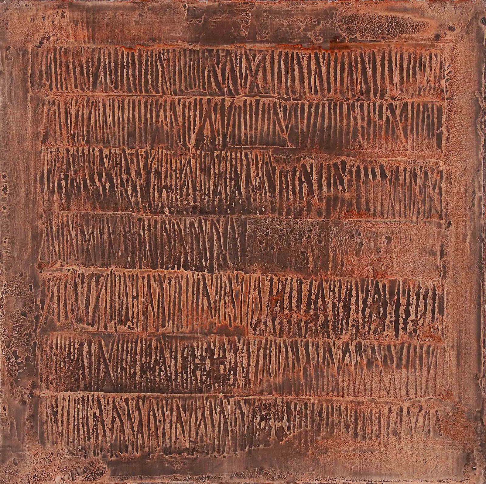 Ősformák – Princípiumok – ezek részben a művész már említett jelkészletének alapformái, de az első formálódás, a földtörténet vagy a kulturális múlt kezdetei is. A Kezdet című kép ugyancsak lehet a világegyetem, de akár csak a mi bolygónk, ugyanakkor az emberiség kultúrájának, illetve a művészet születésének pillanata is – egyben az individuális lét, a művész személyes életútján keresztül az egyes ember életének origóját is jelentheti. A Föld című képek egyértelművé teszik az alkalmazott barnás és okkeres színekből már érzékelhető, a földdel mint matériával való kapcsolatot, ezen belül az Afrika cím utal a kultúra és az emberiség bölcsőjeként nevezett földrajzi helyre. Aztán belépnek az alapformáknak mint a művész ábécéjének betűivel való azonosítást egyértelműbbé tevő címek: Földírás, Írás és mező, Írásmező. Ugyanakkor az írás itt nem a szöveg betűre lebontása, vagy jelentésének értelmezése, hanem az általa kirajzolt textúra szempontjából válik fontossá az alkotó számára – az emberi kéz által létrehozott írásmezők, és az organikus struktúrák között von ezzel párhuzamot. Mindkettőben az élőt, a rendszerbe szervezett spontaneitást hangsúlyozva, amely szertelen mégis strukturálisan felépített nyomot hagy.