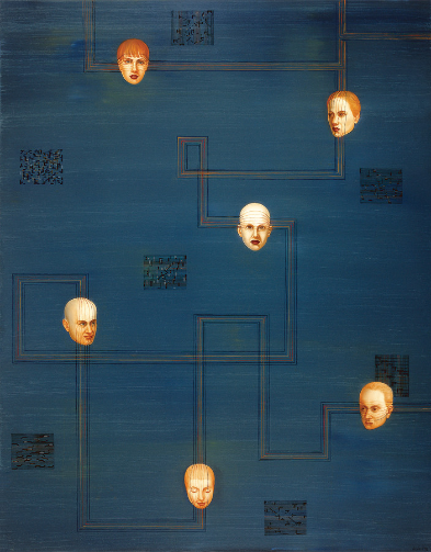 Várady Róbert (1950) nézőpontokat és ábrázolási rendszereket vegyítő, hálózattá szublimált, a képtér végtelen űrjében lebegő tárgyakat, arcokat megjelenítő festészetét első megközelítésben úgy interpretálhatjuk, mint a komputer-világ festett párhuzamait. Hiszen a nála megjelenő terek szerkezete és a képcímek (például a többször előforduló ’cyber’ szó) ezt indokolják. De festészeti elemeinek gyökerei egészen az egyiptomi vagy a minószi kultúráig vezethetők vissza. A síkdekoratív háttér, tapétaszerű mintázatán vagy monokróm felületén plasztikusan megjelenő naturalista elemek analógiáit pedig akár a szecesszióban is megtalálhatjuk. Fontosnak tartom ezeknek a történeti előzményeknek a hangsúlyozását, mert úgy gondolom, hogy festészeti szempontból a múltba visszanyúló, abból táplálkozó, s ezáltal archaikus vonásokat hordozó mozzanatok éppoly fontosak nála, mint képeinek filozofikus tartalmai, vagy a legújabb képzőművészeti médiumok (például a számítógép) által alkalmazott módszerek hatása. Az új médium hívei örömmel értelmezték tehát képeit a számítógép festészetre gyakorolt hatásaként (tehát egy fordított műfaji „másolat”-ról is beszélhetnénk). Ugyanakkor Várady Róbert par excellence festő, így művészetének lényegéhez közelebb kerülünk a festészeti eszközök és tradíciók vizsgálata által, mint csupán a felszínes formai hasonlóságok és a tartalmi vonatkozások felől közelítve. Elegendő bizonyíték erre az, hogy Várady Róbert a táblakép (már-már archaikusnak számító) hagyományos műfajában, elsősorban olaj technikával alkot. A komputervilágban használatos cyber szó (mint már említettem) a címadásban ugyan konkrétan is megjelenik, de ezeknek a szintén hagyományos technikával készült festményeknek (!) a cybertereiben realisztikusan ábrázolt, valós emberalakok illetve -fejek láthatók. A testek között kapcsolatot teremtő utak labirintusszerű kanyargása azonban szintén ókori utalásként értelmezhető. A kezükben pisztolynak látszó tárgyat tartó férfiak és nők (Cyber II.) pandanjaként jelennek meg a Szimulakrumok I. (2003) című képen a videokamerát illetve fényképezőgépet szemük elé emelő, a térben elszórtan megjelenített emberek. Várady festményei kapcsán alapvetően a régi és új médiumok közötti konceptuális kapcsolódásról beszélhetünk. Őt nem az elektrográfiai eszközök technikai megoldásai, hanem a komputer virtuális világa foglalkoztatja. Ebben a világban megszűnnek a téri és időbeli határok és korlátok. Itt minden megtörténhet. Például az ifjú Wittgenstein találkozhat időskori önmagával (és fordítva), valamint a pop-ikonnal Madonnával is, ami ugyanolyan fizikai képtelenség (A fiatal Wittgenstein és az idős Wittgenstein és Madonna az interface-ben, 2006). Tehát a számítógépes képszerkesztéssel párhuzamba állított kép tere, nála minden esetben metafizikussá tágul, azaz a tapasztalat határán túli tartományokba vezet. A képein izolált világokként, látszólag egymástól függetlenül lebegő testekkel mutat rá a nagyobb összefüggésekre, amelyekkel matematikai és filozófiai rendszerek, vagy a kibernetika tudománya is foglalkozik. Várady Róbert labirintusának mélyén az autonóm alkotó személye, a festő rejtőzik. Elrejtőzik a külvilág elől. Előlünk, interpretációs kísérleteinkkel képeinek többrétű jelentésrétegei között botorkáló művészettörténészek és művészeti írók elől. Elrejtőzik ugyan, de nem menekül(het).