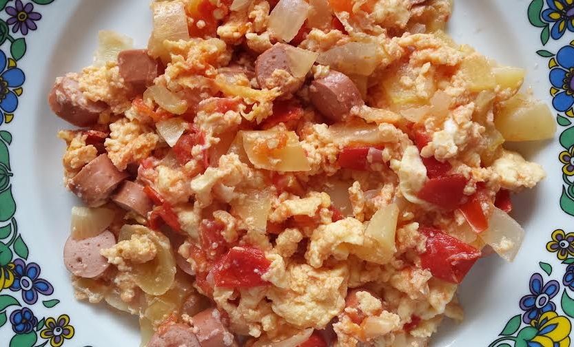3. Serpenyőbe kiveszünk egy adagot, amennyit egyszerre megeszünk, mert tojással csak frissen az igazi a lecsó. Villával felverünk pár szem tojást (fejenként 2 darabot érdemes számolni). A serpenyőben forrósítjuk kicsit a kiszedett lecsóadagot, és ráöntjük a felvert tojásokat. Addig sütjük, amíg a tojás meg nem sül.