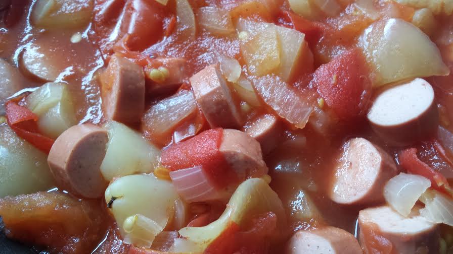 2. Felkarikázzuk a virslit (de lehet persze főzőkolbász, vagy száraz, füstölt kolbász is, de ezeket jobb a hagymával együtt pirítani, hogy a zsiradék kisüljön belőlük). Ezt belerakjuk a lecsóba, és egy picit együtt főzzük, amíg a virsli kicsit meg nem dagad. Én ez alkalommal füstölt baromfivirslit használtam.