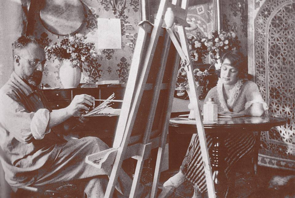 Henri Matisse with model Henriette Darricarrere – in the pose of the Liseuse au gueridon – 1921