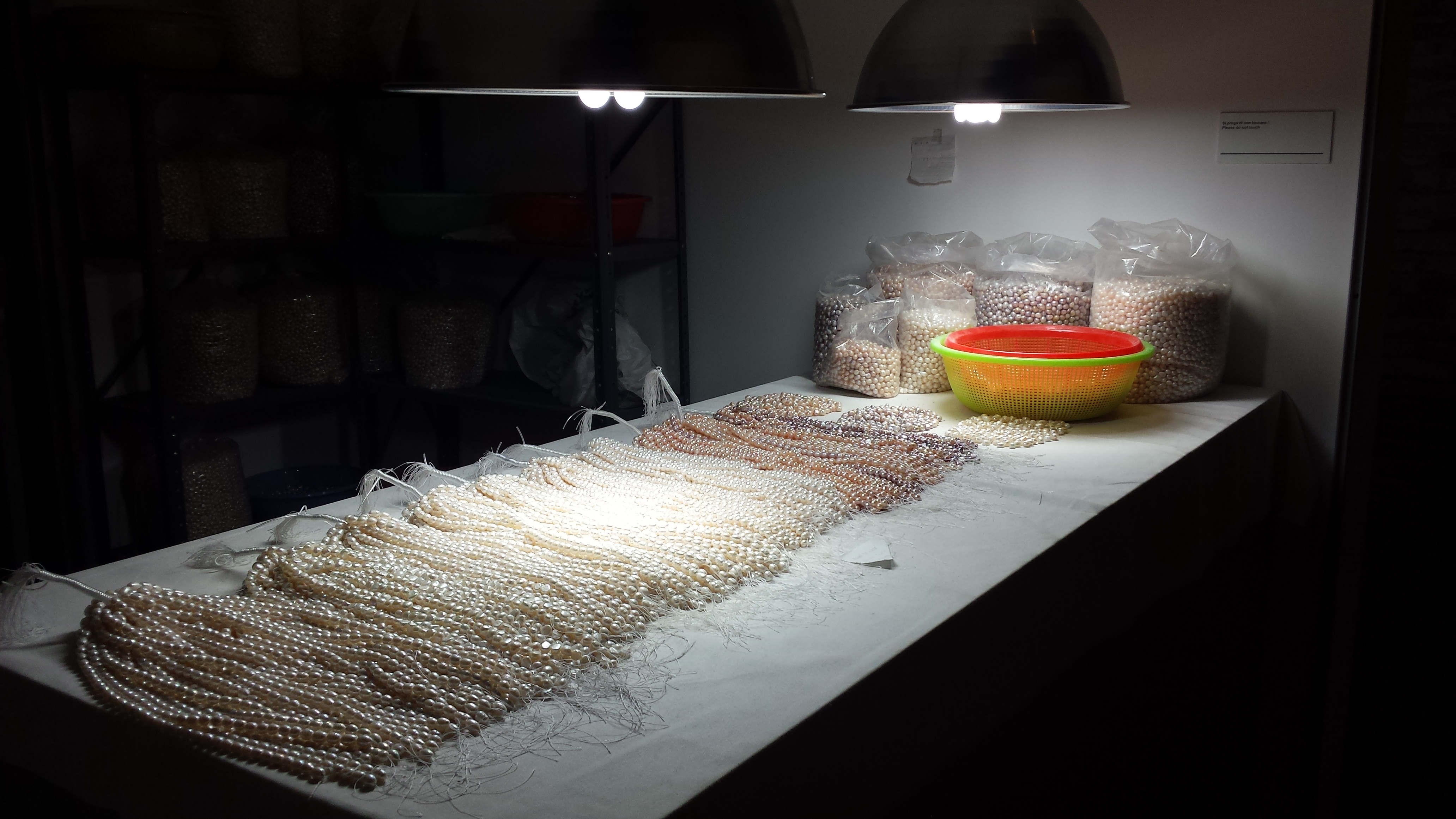 A table filled with pearls outside of Mika Rottenberg’s video installation NoNoseKnows 2015
