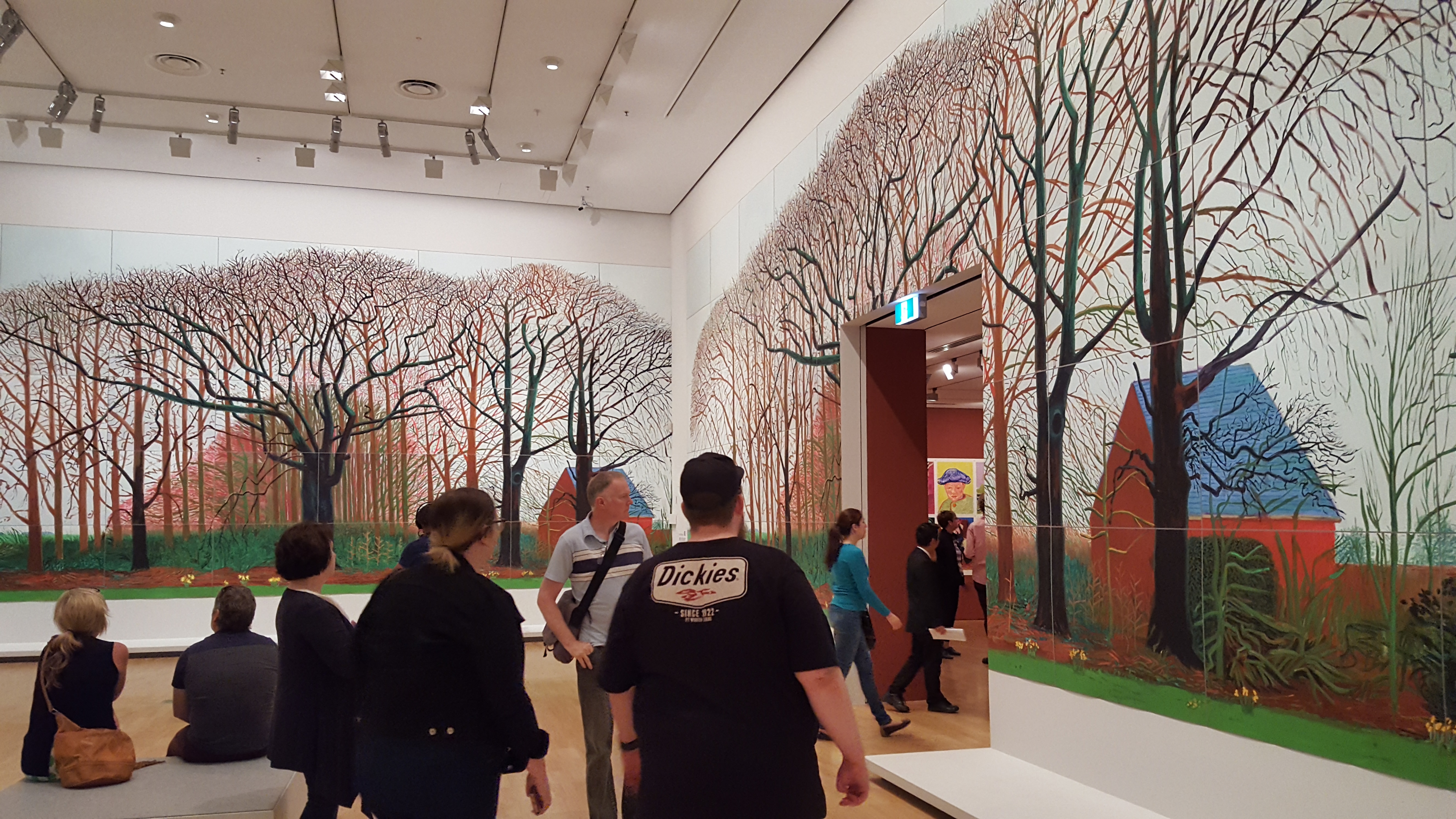 The exhibition includes Bigger Trees Near Warter, Hockney’s largest painting comprised of fifty oil on canvas panels, and the centrepiece of Hockney’s hugely popular exhibition Bigger Picture at the Royal Academy, London which he subsequently gifted to the Tate. Transforming the gallery, the three remaining walls of this space display 1:1 digital versions of the same work, the first time that this major work has been exhibited in Australia.