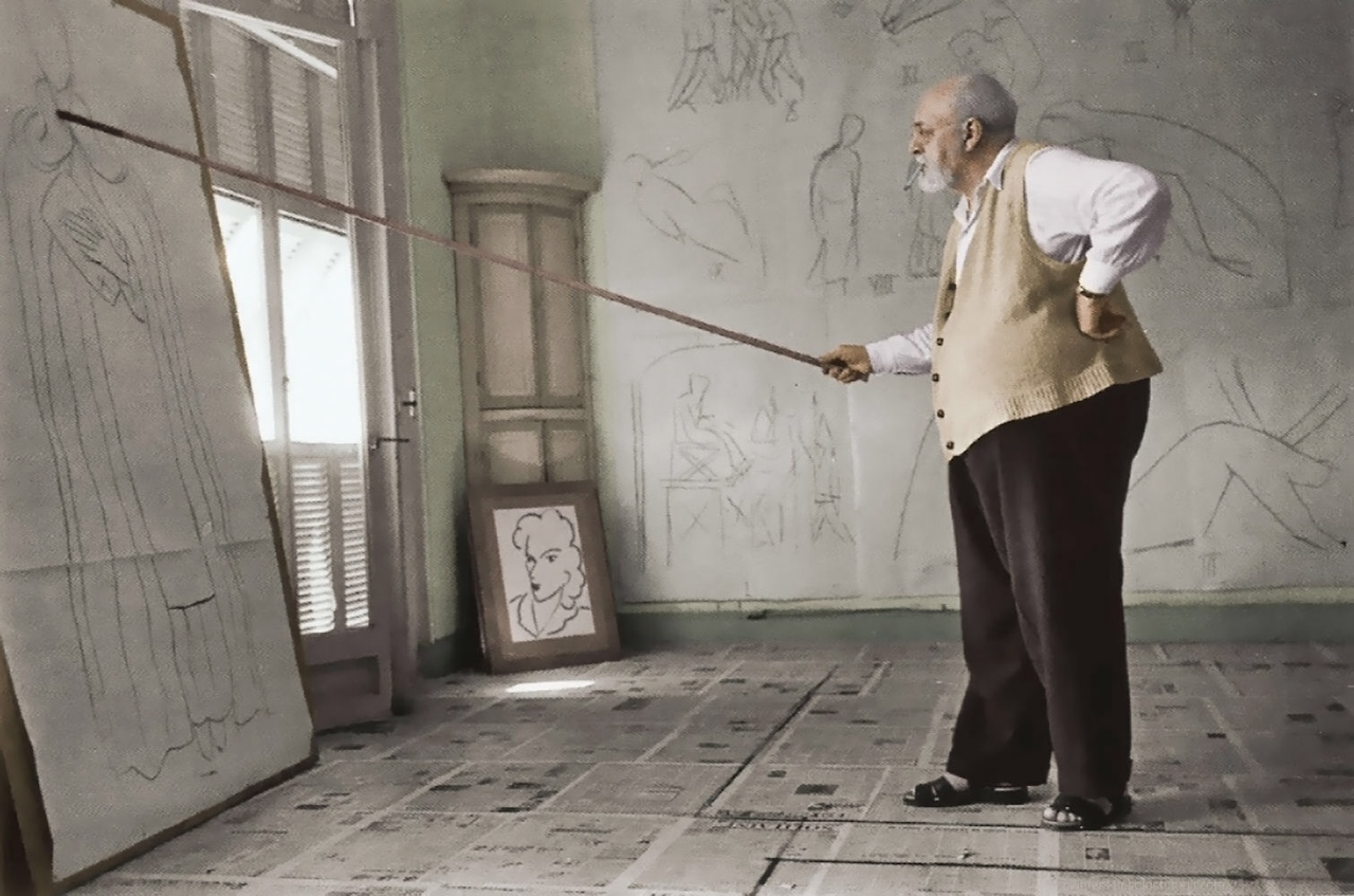 Henri Matisse drawing sketches for the murals of the Dominican chapel in Vence on the French Riviera 1949
