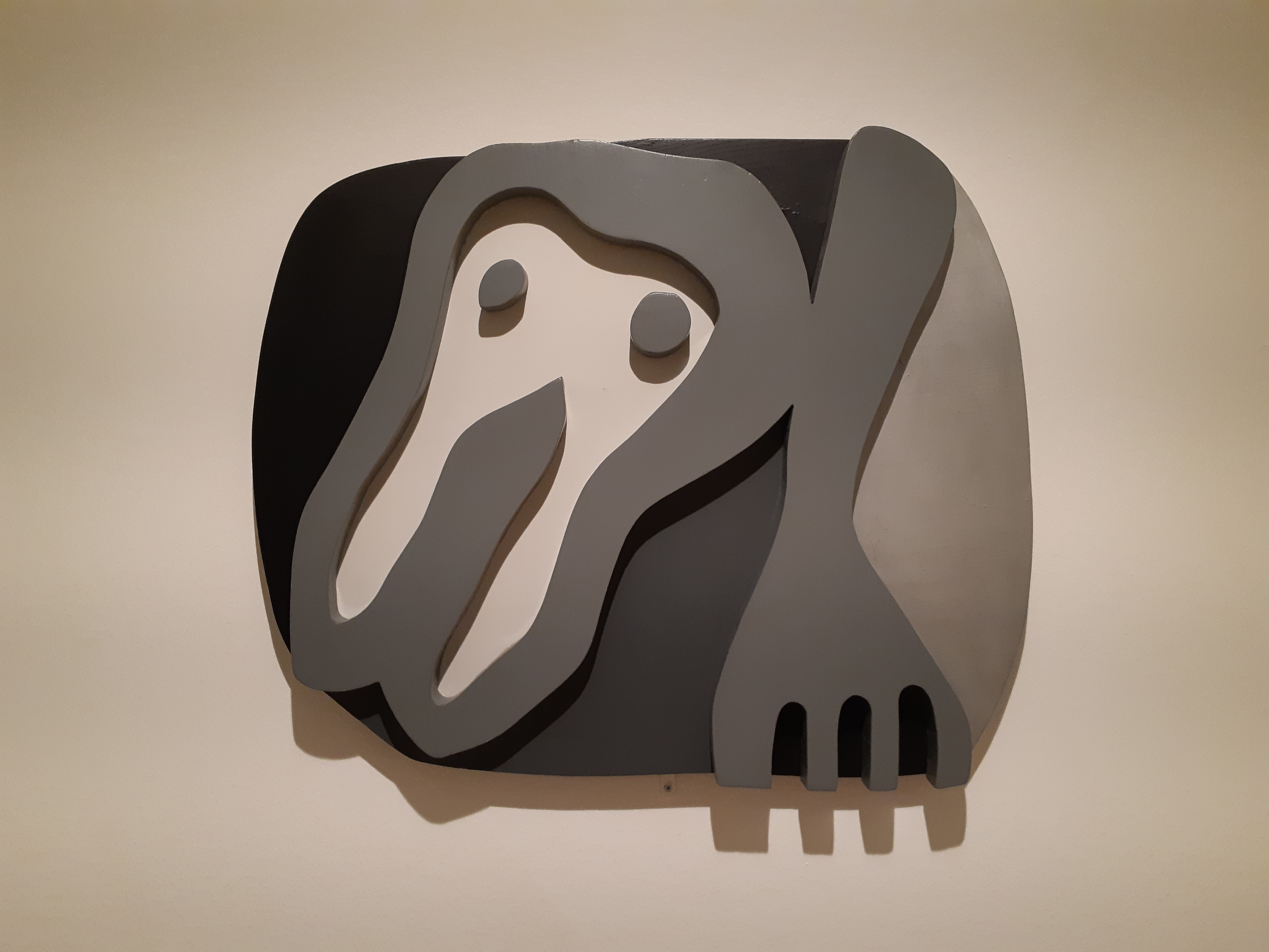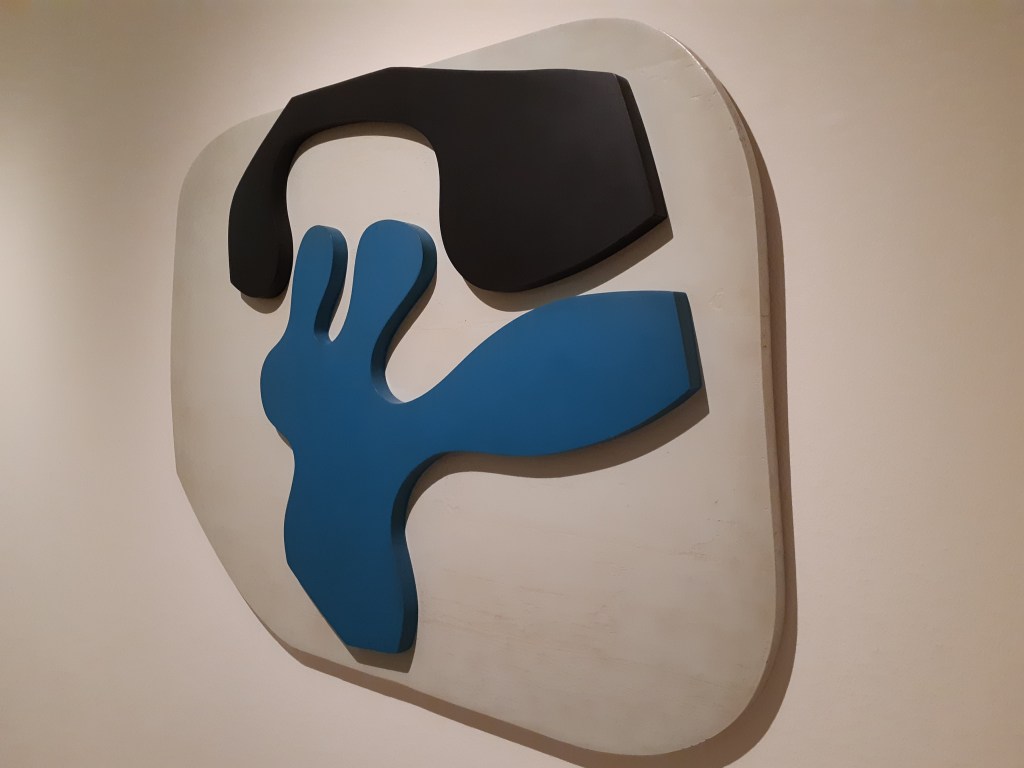 Arp stacked layers of wood, cut by carpenters, joined them with screws and painted them with defined areas of color. He often took them apart and reconfigured them. Hung in orientations high and low to expose their thickness and grain, the subjects of the works were hybrids of things that gave them an absurd twist of humor, much like his poetry.