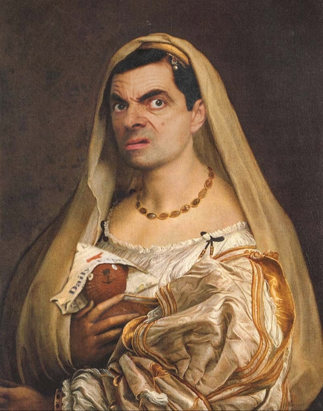 Rowan Atkinson (Mr. Bean) in role of Raphael’s painting The Woman with the Veil