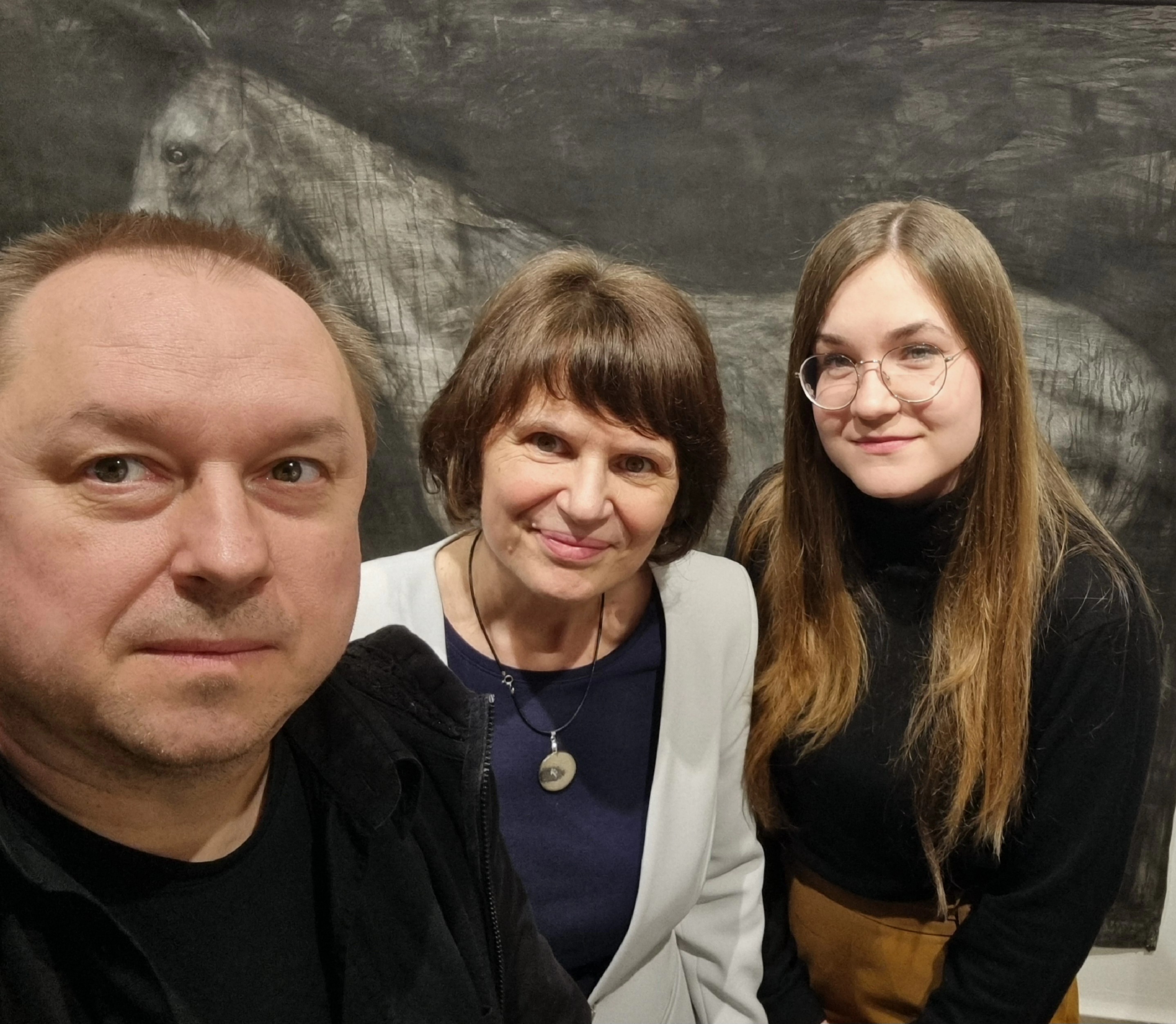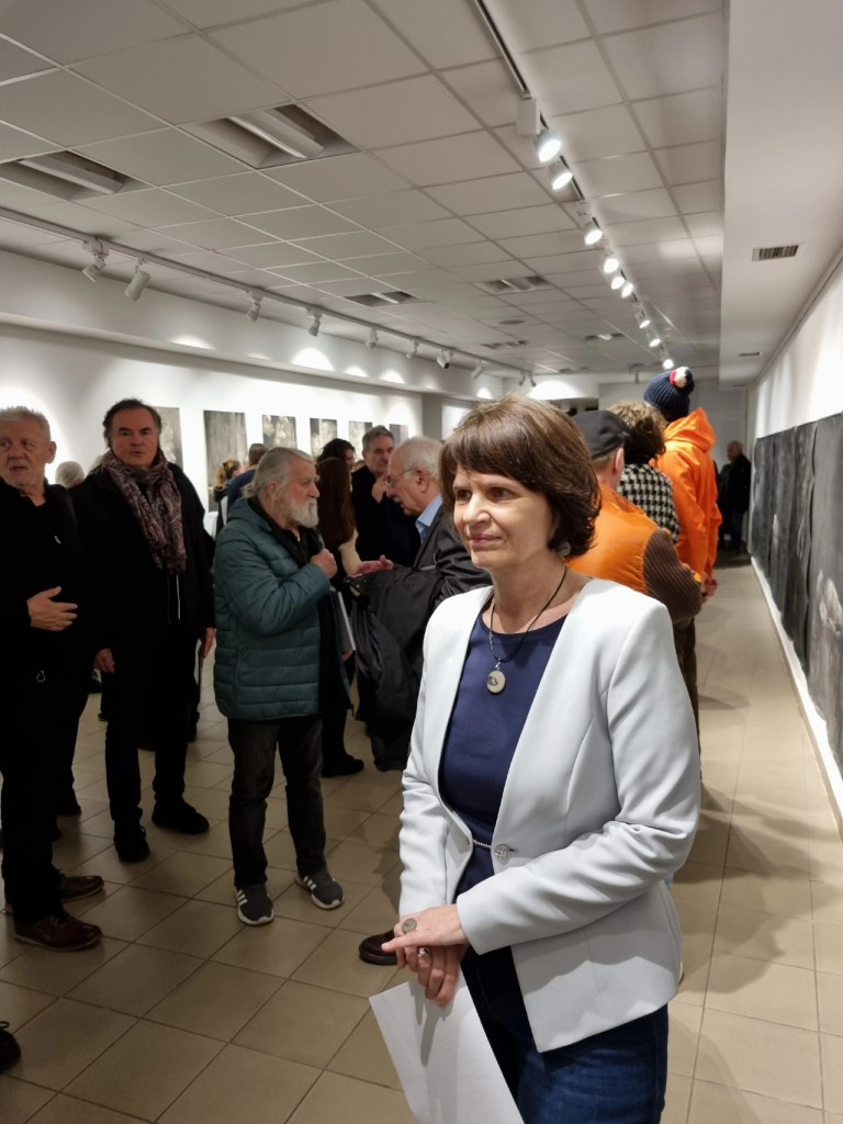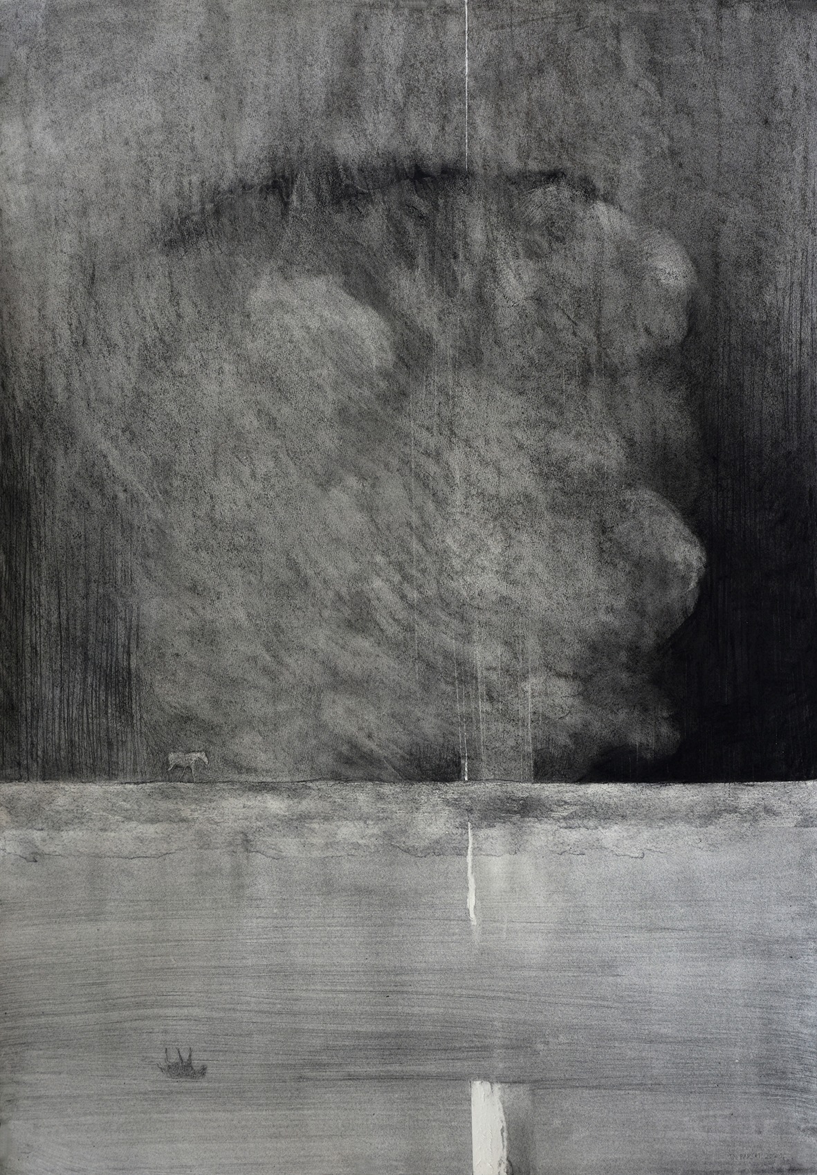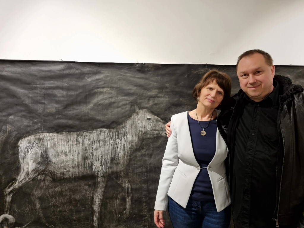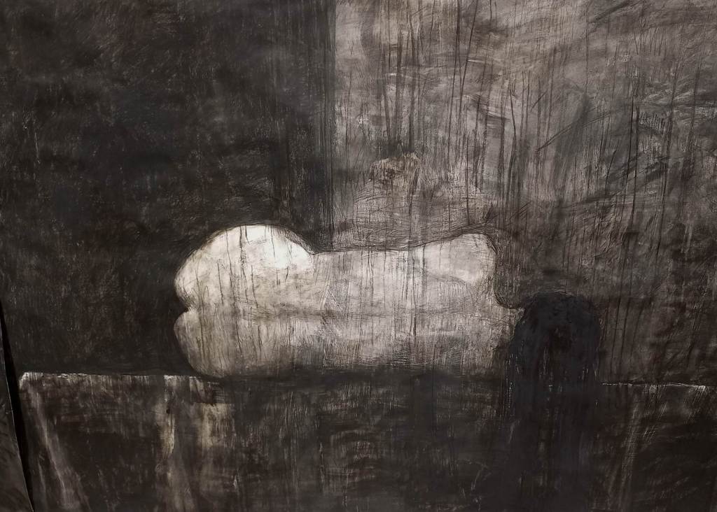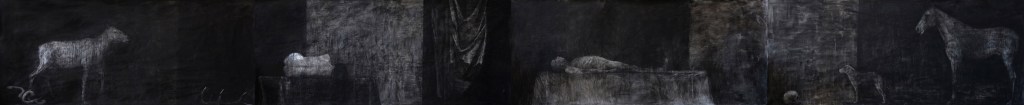 Talán ugyanez a szarvas, agancsát éppen elhullatva, indítja a tárlat fő falán látható fekvő téglalap formátumú hosszúkás szénfestményt.