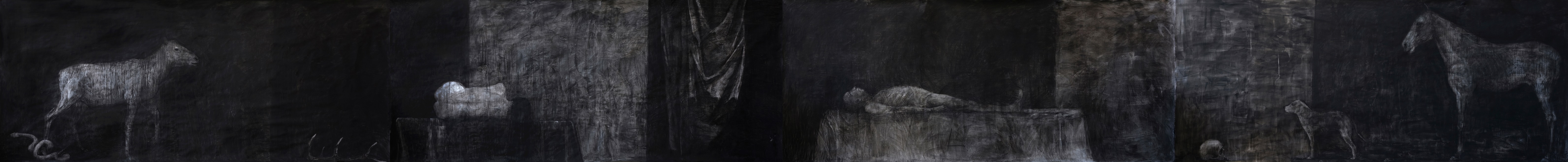 A fríz sötét felületén felbukkanó minden tárgy és lény egyformán részletezőn és érzékenyen kidolgozott. A fekete háttér metafizikus dimenziókba emeli őket, ugyanakkor egyfajta folytonosságot teremt közöttük. Szarvas, női akt, drapéria, koponya, ravatal, kutya, ló, ember, kígyó. Mind ugyanazzal az erőtlen fénnyel pislákolnak a sötétben. (Kivéve a fekete macska.)